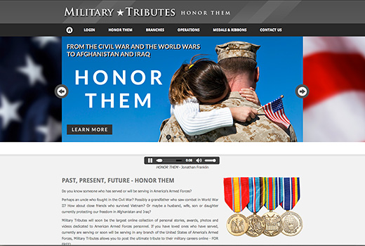 Do you know someone who has served or is currently serving in America's Armed Forces? Perhaps an uncle who fought in the Civil War? Possibly a grandfather who saw combat in World War II? How about close friends who survived Vietnam? Or maybe a husband, wife, son or daughter currently protecting our freedom in Afghanistan and Iraq? Military Tributes will soon be the largest online collection of personal stories, awards, photos and videos dedicated to American Armed Forces personnel. If you have loved ones who have or currently are serving in any branch of the United States of America's Armed Forces, Military Tributes allows you to post the ultimate tribute to their military careers online - FOR FREE!