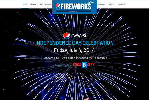 The official website of the annual Pepsi Independence Day Fireworks Celebration in Johnson City, Tennessee. The celebration is a day-long event held on or around July 4th at Freedom Hall Civic Center and hosts multiple food vendors, musical entertainment, drawings and prizes, and ends with a spectacular 20-minute fireworks show. The official site provides photos from past celebrations, an event schedule and directions to the celebration, in addition to a yearly update of area sponsors.