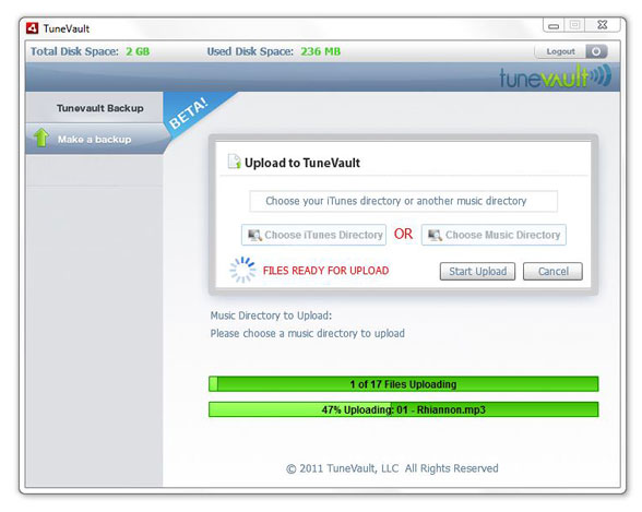 TuneVault provides online backup via upload of media files - music, video and photographs. The TuneVault desktop application was developed with Adobe AIR, Flash Builder / Flex, ActionScript 3, SQLite database and XML. Catering to Apple iTunes users, the app features custom options for Mac and Windows users to choose their entire iTunes library. If the user prefers a Linux OS or they simply aren't an iTunes user, another custom option allows manual selection of a media directory to backup.